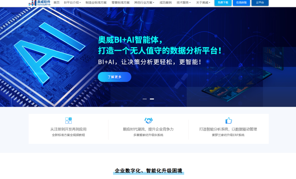 奥威BI(又称Ourway BI或SpeedBI)是一款专为中国企业设计的BI数据分析工具,提供自助式敏捷分析与全流程可视化能力。平台支持大数据与云端部署,结合十余年行业经验,主打“安装即可用”的大屏可视化与移动应用,适合希望快速构建数据驱动体系的企业用户。