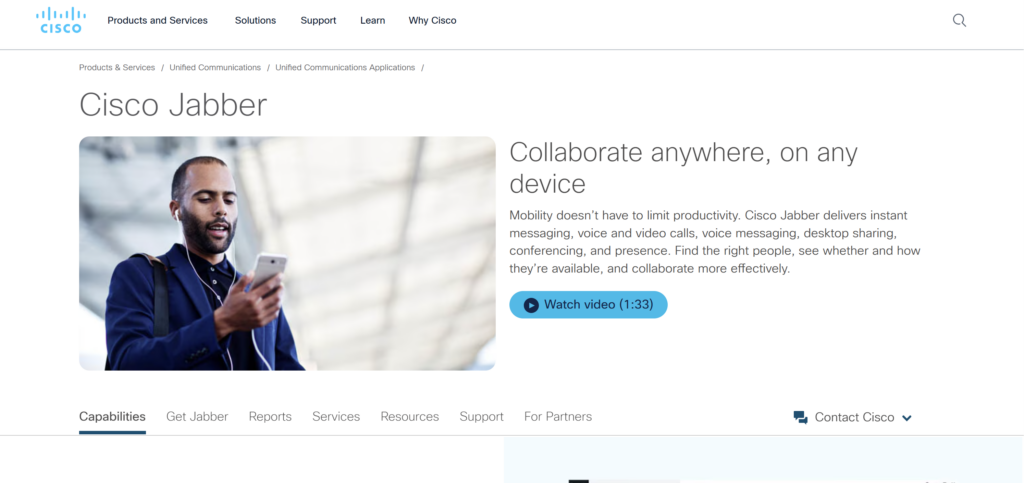 Cisco Jabber 支持一对一聊天、群聊及持久聊天室,提供文本、语音、视频、文件传输与屏幕共享等多种通信方式,兼容 Microsoft Outlook 和 Office 的一键呼叫与日历集成功能,并支持软电话(Softphone)、语音信箱、呼叫转移等企业电话功能 。