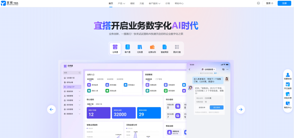 宜搭提供丰富的可视化表单搭建、流程引擎配置、报表与大屏数据可视化功能,支持关联表、公式运算、跨表联动等数据处理能力,同时具备组件化布局、自定义页面设计及OpenAPI接入第三方系统的能力