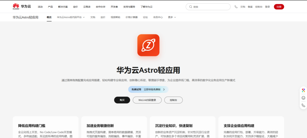 华为云·AppCube(现称 Astro Zero) 是华为云推出的企业级前端低代码引擎平台,为用户提供从“零代码”到“低代码”开发一体化体验。该平台支持通过可视化建模与积木式组件拼装,快速构建后台管理、业务流程与数据大屏应用,具有三阶段环境(开发、测试、生产)隔离机制,适用于不同规模的企业数字化转型场景 。