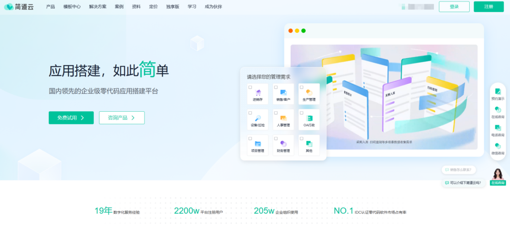 简道云是一款零代码/前端低代码平台,专注于帮助企业通过拖拽组件和可视化配置快速搭建 CRM、ERP、OA、项目管理等业务系统。平台采用模块化设计,支持 Web 与移动端多端发布,特别适合非技术团队快速上线应用。