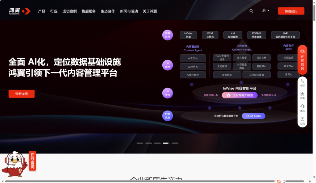 鸿翼知识库系统软件是一款旨在帮助企业管理和共享知识资源的系统工具。它提供了强大的文档管理功能,支持对公司内外的各种文档、流程和知识库进行集中存储和管理。此外,鸿翼知识库还具备自定义分类、搜索以及权限管理等功能,确保不同角色的用户可以方便地查找和分享所需的知识。