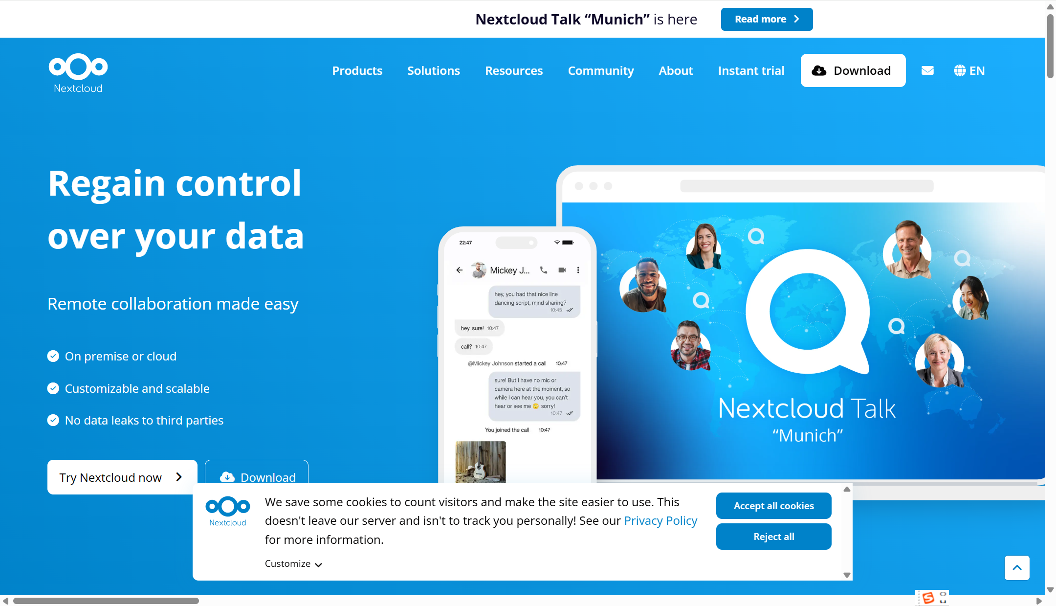 Nextcloud 是由 Nextcloud GmbH 发起的开源私有云存储与协作平台,支持自建部署在私有云或公共主机环境中使用。它具备文件同步、共享、通讯及协作工具等核心功能,旨在提供与 OneDrive 或 Google Drive 相当的本地自主控制能力。Nextcloud 支持跨平台客户端(Windows、macOS、Linux、Android、iOS),同时通过 WebDAV、FUSE 等方式方便访问文件,实现高灵活的日常使用体验 。
