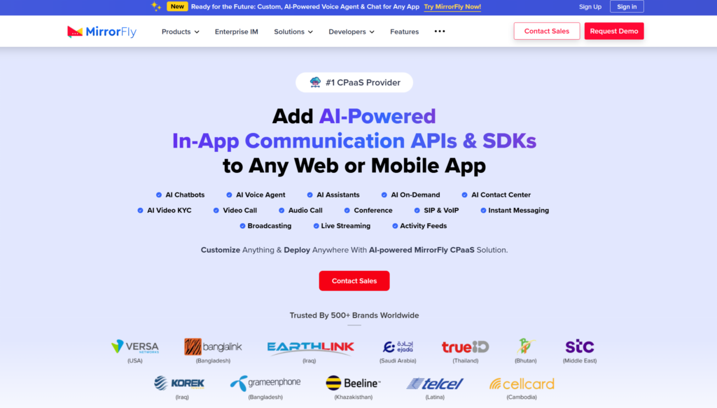 MirrorFly 是一款由 Contus Tech 推出的全栈实时通信解决方案,主要面向企业提供集成语音通话、视频通话和即时通讯(IM)功能的 SDK 与 API。该产品支持完全自托管部署,也提供 SaaS 云版本,帮助开发者在各类平台(如 iOS、Android、Web)中快速集成高质量通信服务,广泛应用于社交平台、在线教育、远程医疗、电商和协作办公等场景。