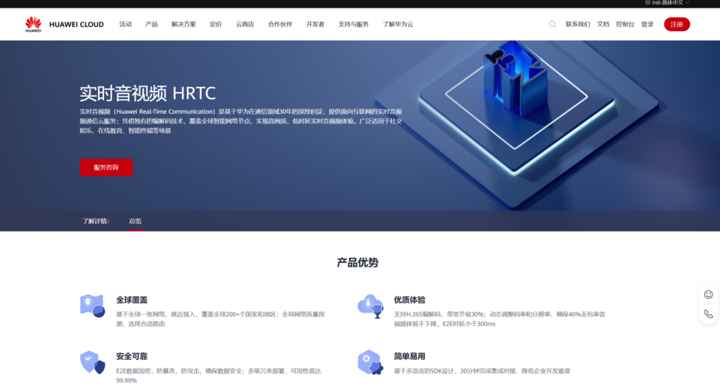 华为云实时音视频(SparkRTC)是一款面向企业和开发者的全栈实时通信解决方案,基于华为多年在音视频技术领域的积累,提供端到端的实时音视频服务。该平台具备全球网络节点支持、低延迟传输、弱网抗性和多终端兼容能力,适用于教育直播、远程医疗、在线会议、社交互动等多种场景。华为云RTC服务以稳定性、安全性与扩展性著称,服务可用性达99.99%,并支持端到端 AES 加密,保障数据传输安全。