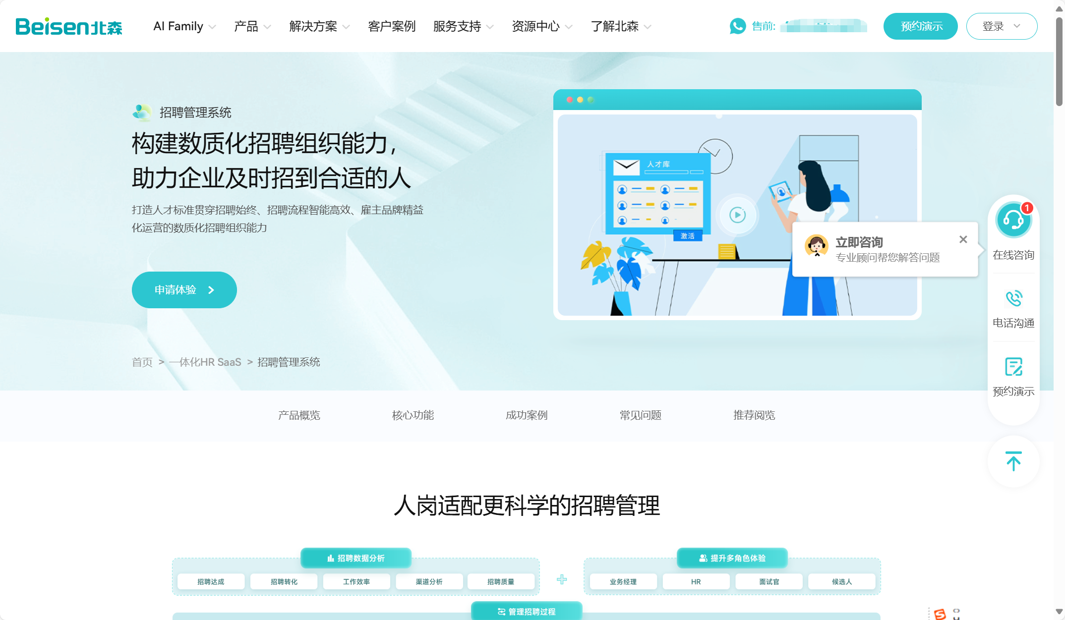 北森(Beisen)招聘管理系统是一款在国产 HR SaaS 领域具备领先地位的人才招聘管理工具,被超过 6000 家中大型企业采用,包括 70% 的中国 500 强企业。该系统支持从招聘需求发布、简历自动收集与查重、智能筛选、面试安排到数据分析的一体化流程,帮助 HR 实现招聘流程标准化和自动化,同时与北森财富积累的人才测评体系无缝对接,形成“招测一体”模式,提升人岗匹配效率 。
