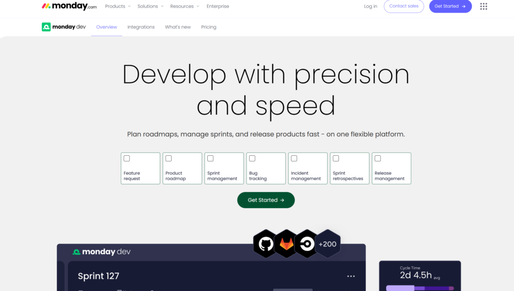 Monday Dev 是 monday.com 面向软件工程与产品开发团队推出的专属版本,聚焦敏捷开发流程和工程协作能力。它提供 Sprint 管理、燃尽图(Burndown Chart)、Epic 拆分、Roadmap 路径规划与自动化规则等功能,旨在帮助团队贯通从规划到发布的整个产品开发生命周期(Sprint planning、retrospectives、bug tracking 等)。
