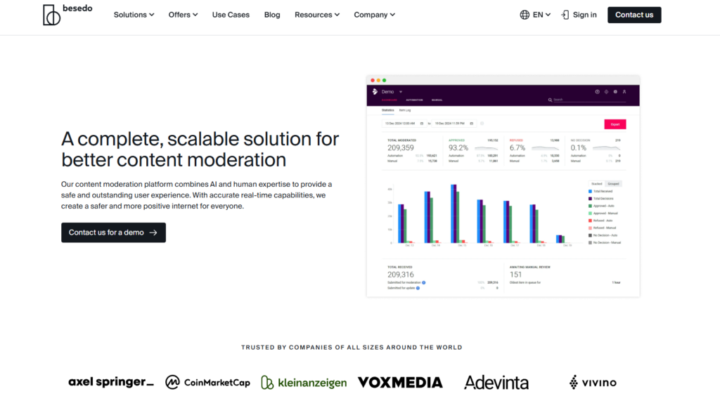 在接入与部署方面,Besedo提供API和SDK接口,并可根据客户需求结合云端或私有化部署模式,无缝融入现有系统架构。平台还配套可视化的运营后台和数据报表,助力企业实时监控审核效率和内容风险分布;同时,经验丰富的内容审核专家团队可提供持续支持,确保审核策略与模型不断迭代优化,帮助客户构建稳健、可信赖的社区生态环境。