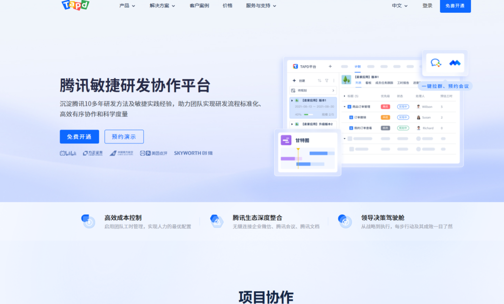 优点: 源于腾讯内部多年的研发实践,深刻理解软件开发团队的痛点和协作模式;功能覆盖面广,为研发团队提供了开箱即用的一站式解决方案,无需拼凑多个工具;与企业微信、腾讯文档等腾讯生态产品无缝集成。