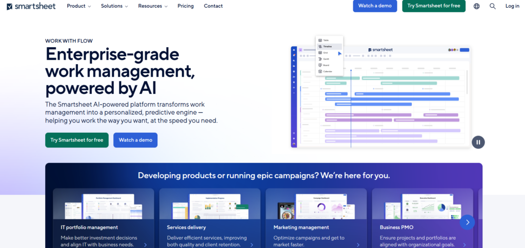 产品简介: Smartsheet 是一款独特的在线项目管理工具,它以增强型的、类似电子表格的界面为核心,集成了自动化、协作和多种视图功能。