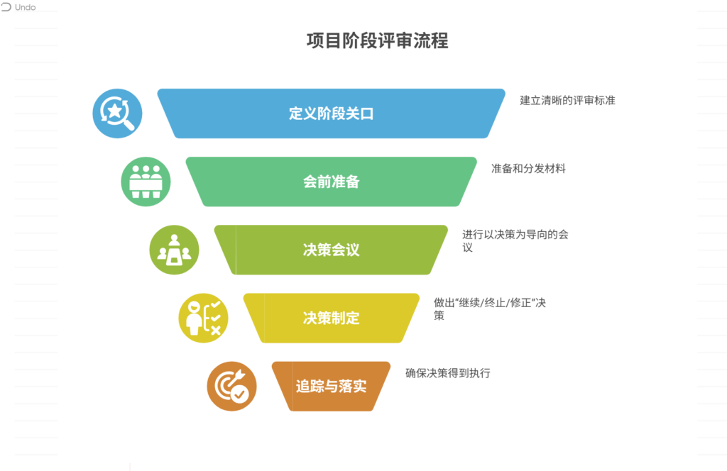 A5: 关键在于坚持让“Kill”成为一个真实存在的选项。如果一个组织在历史上从未在阶段评审中终止过任何项目,那么评审的权威性就会丧失。高层管理者必须以身作则,真正将评审视为严肃的投资决策,并敢于对那些失去价值的项目说“不”。此外,将评审结果与资源分配强挂钩,只有通过评审的项目才能获得下一阶段的正式预算和人力,这也是确保