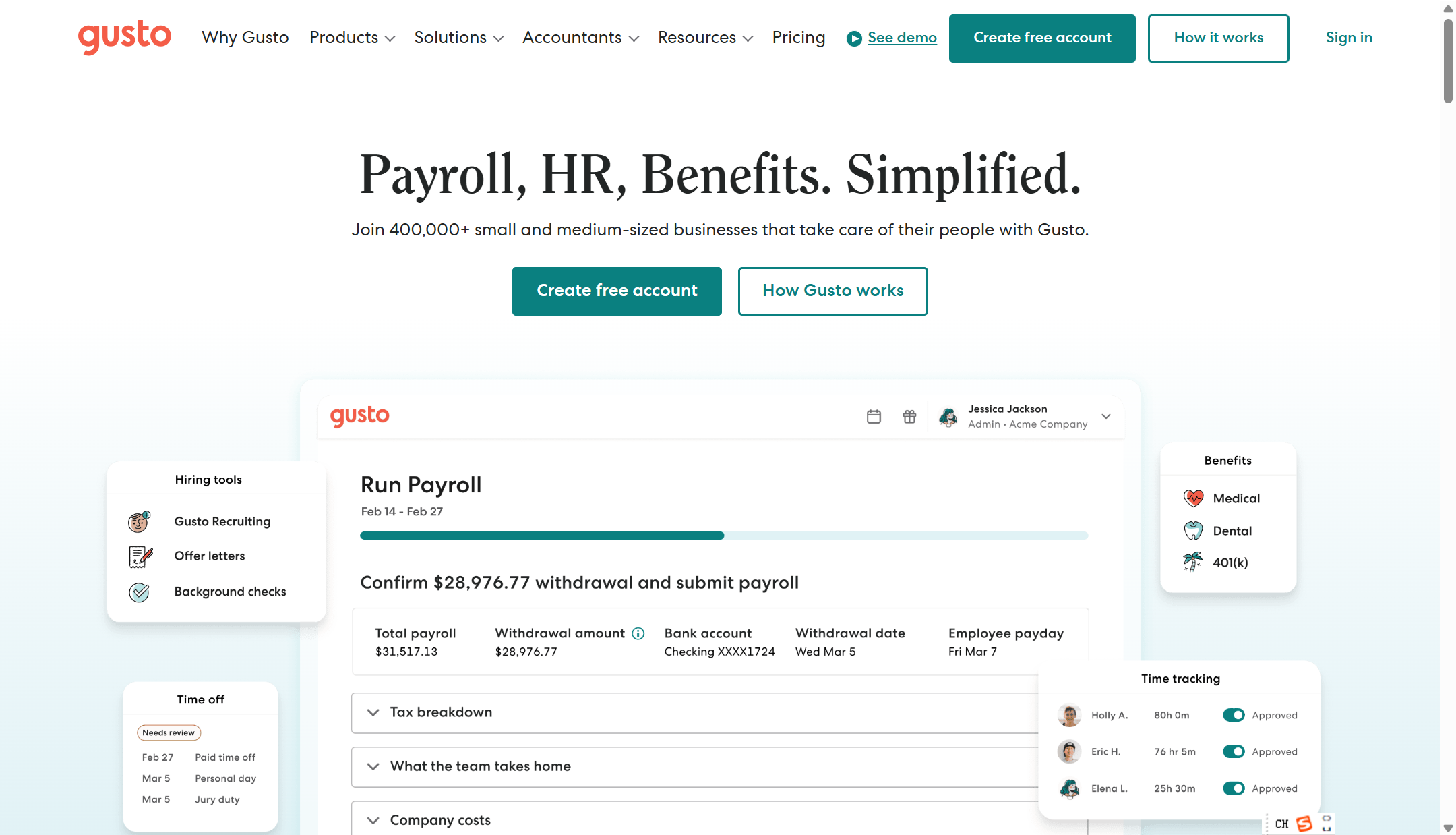 Gusto 凭借其“无缝整合、界面友好、合规自动化”的特点深受用户欢迎。用户可以通过几次点击完成薪资发放,包括自动报税、在线填写 W-2 和 1099 表单、自动处理工资扣缴(如小费抵扣、子女抚养费等),并提供员工自助服务功能,如查看工资单、税表及福利。此外,Gusto 与主流会计软件和考勤工具具备深度集成能力,支持雇主同步 HR 流程和财务流程。