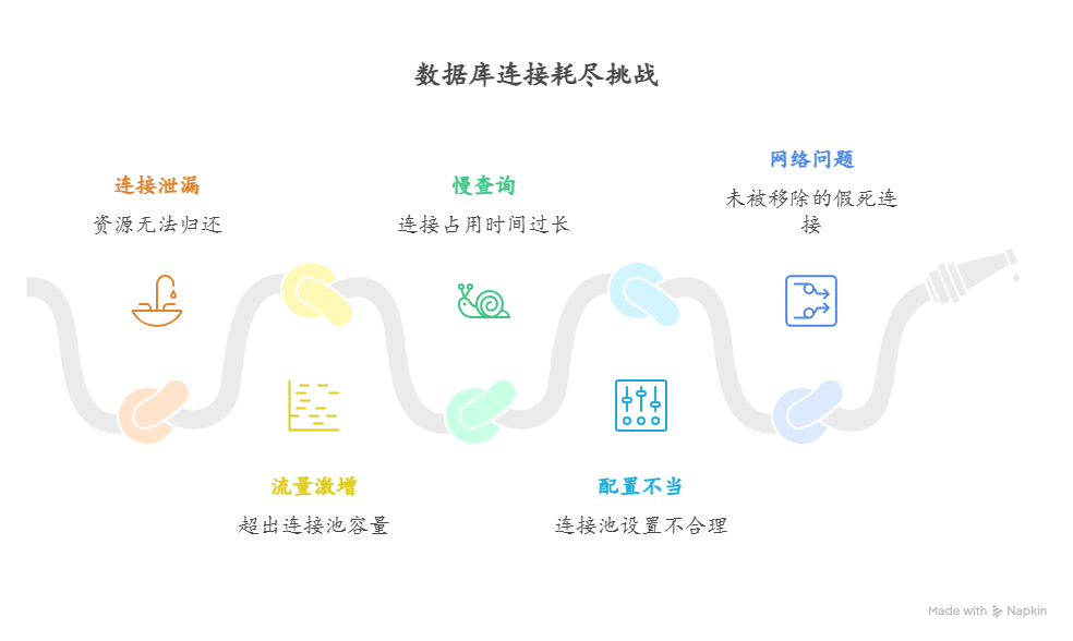 应用程序之所以会突然耗尽所有可用的数据库连接,其核心原因在于程序对“连接”这一珍稀资源的“申请”与“归还”之间出现了严重的、系统性的“收支不平衡”。这种不平衡通常并非由单一因素造成,而是由多个潜在的“元凶”共同或独立作用的结果。导致连接池耗尽的五大“罪魁祸首”涵盖:程序中存在“连接泄漏”导致资源无法归还、突发的“流量洪峰”超出了连接池的容量上限、大量的“慢查询”长时间“霸占”连接不释放、连接池自身的“配置”不合理、以及网络问题导致的“假死”连接未能被有效剔除。