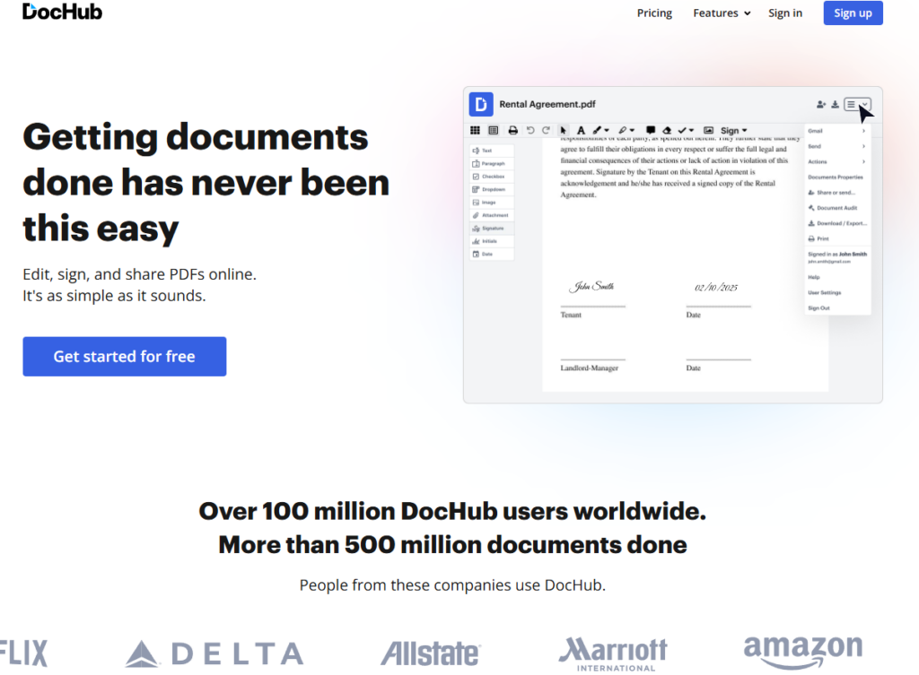 核心功能:在线PDF文本编辑与注释;表单填写与创建;安全的电子签名与签名请求工作流;页面管理(合并、旋转、删除);与Google Drive、Dropbox等云存储的集成。