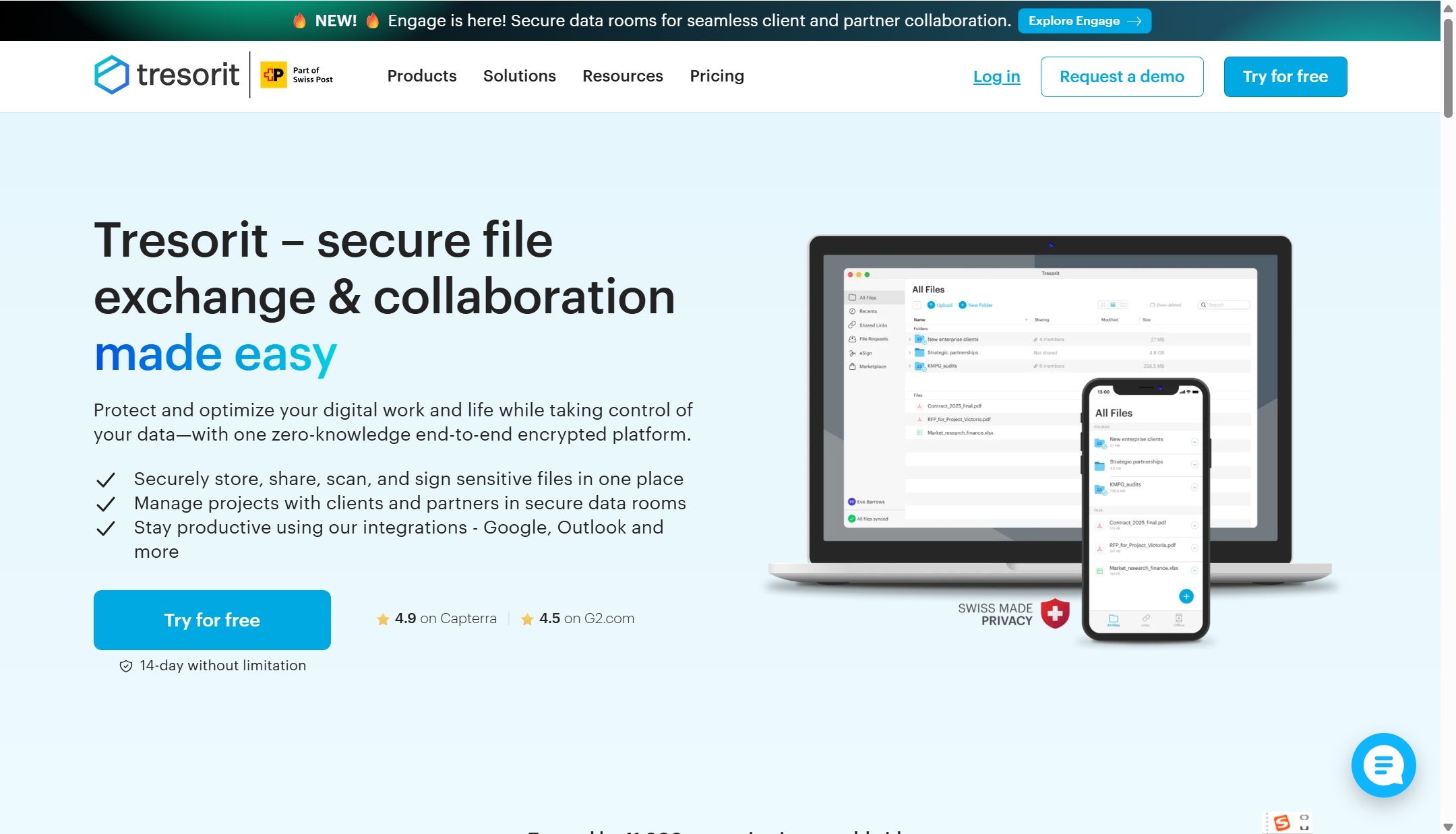 Tresorit 企业云盘 是一家总部位于瑞士的云存储平台,自 2011 年成立以来专注于为企业用户提供高度安全与隐私保护的解决方案。其核心特点是端到端加密(E2E)与零知识架构——用户的文件在本地即完成加密,只有用户持有密钥,Tresorit 服务端无法访问内容或明文密码。此外,Tresorit 的安全性获得了多项国际认可,如由 Ernst & Young 进行的安全评估、ISO 27001 认证,以及在 Gartner Peer Insights 和 Deloitte Technology Fast 50 等评选中的肯定 。