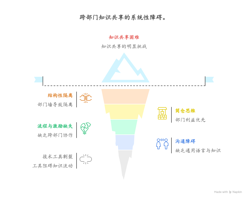 化、缺乏有效的跨部门协作流程与激励机制、各部门间“通用语言”与知识背景的缺失、以及技术工具的割裂共同构筑了知识流动的壁垒。