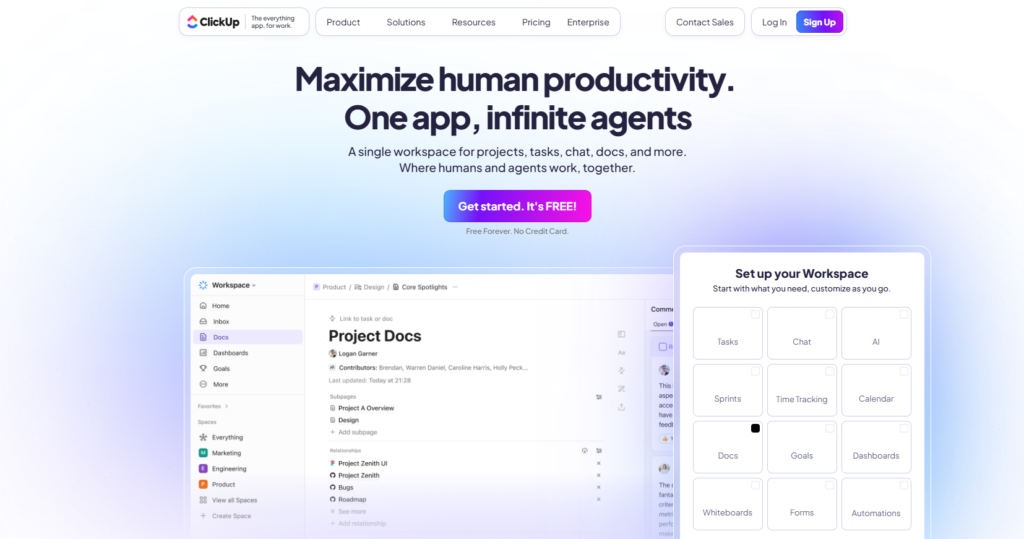 产品简介: ClickUp 是一个旨在“取代所有其他应用”的All-in-One效率平台,它将任务管理、文档协作(ClickUp Docs)、目标设置、白板等功能整合在同一个环境中,知识库是其文档功能的一个核心应用。