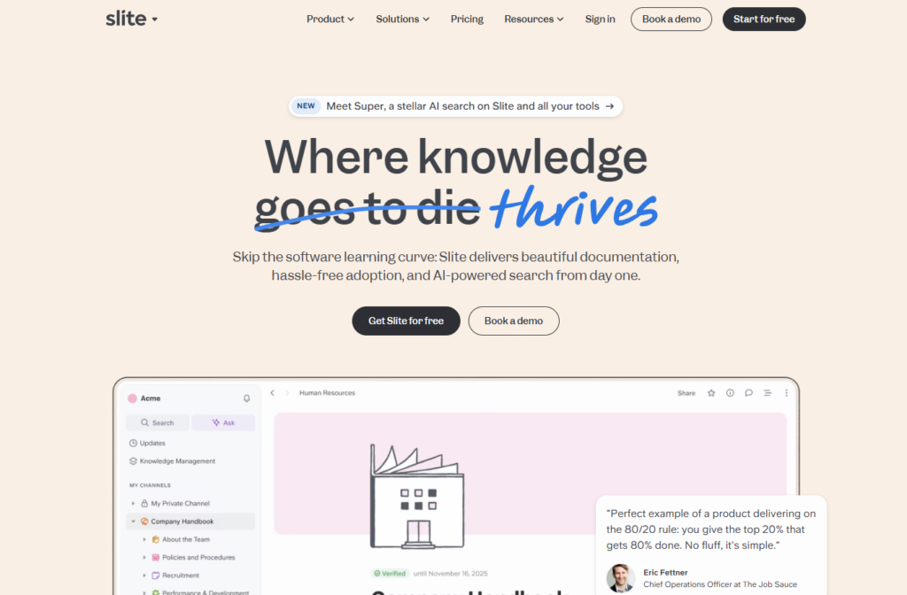 总结: Slite 并不仅仅是一个文档工具,它更像是一个为现代团队设计的“信息总部”。它通过优秀的设计和聚焦于异步沟通的功能,帮助团队在纷繁的信息中保持专注与同步,特别适合那些希望建立开放、高效协作文化的成长型团队。