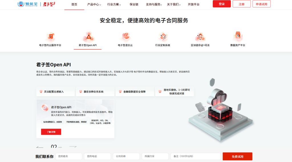 该平台的服务广泛应用于人力资源、B2B交易、租赁、教育等多个行业场景。它提供的标准化产品和开放API接口,既能满足中小企业开箱即用的需求,也能支持中大型企业进行个性化的系统集成,是一个适用性较广的通用型电子合同服务平台。