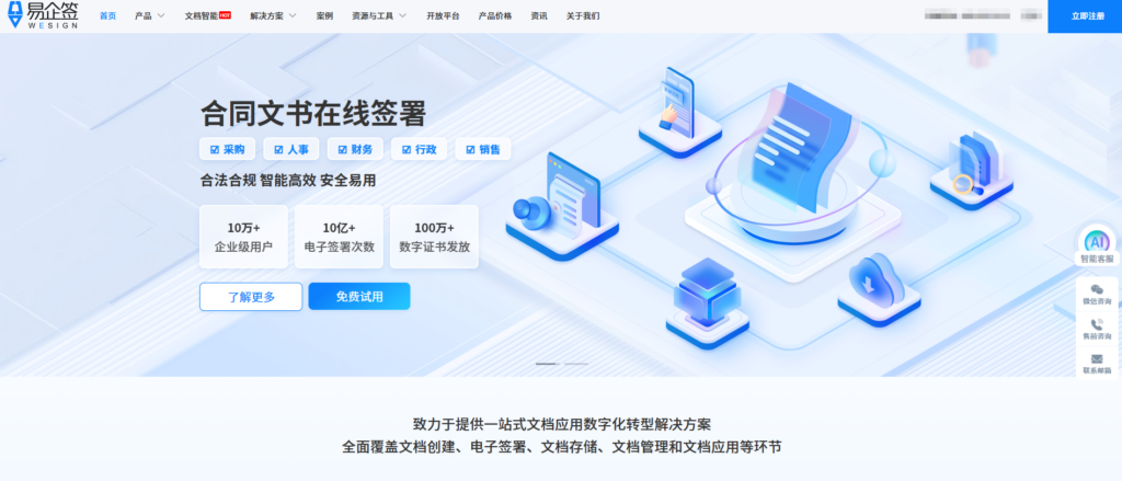 易企签在功能设计上力求全面,不仅提供标准的签署服务,还提供合同履约管理、智能法务审查等增值服务,希望成为企业的一站式合同管理中心。平台的服务网络广泛,致力于为不同规模和行业的企业提供灵活且高效的数字化签约解决方案。