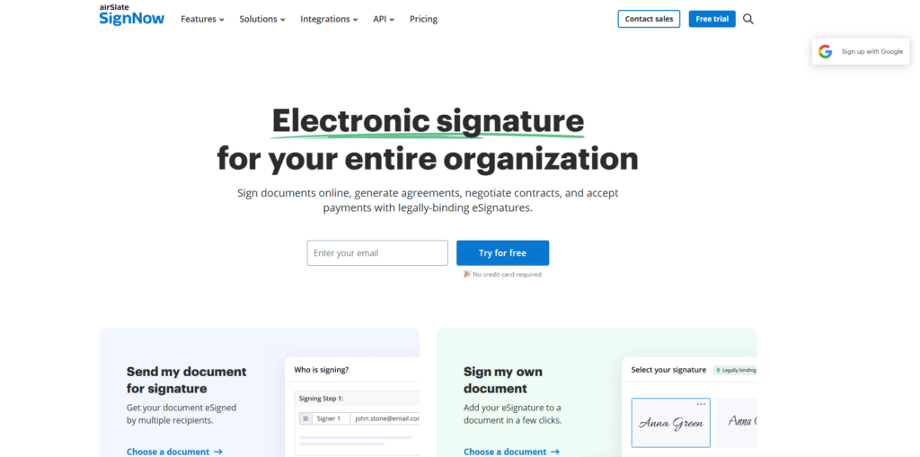SignNow是一款广受欢迎且性价比很高的电子签名解决方案,以其简洁的界面和易用性著称,非常适合中小型企业和团队。它提供了所有核心的电子签名功能,包括创建可复用模板、设置签名顺序、批量发送文档等,并且能够轻松集成到Google Workspace、Salesforce等众多主流的云服务中。