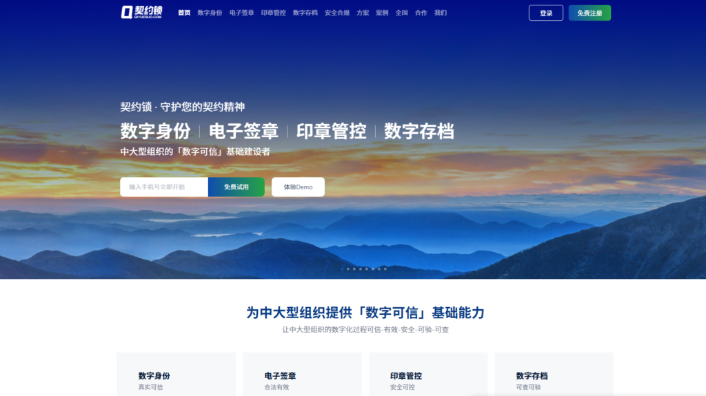 核心功能:提供基于权威CA数字证书的电子签名与签章服务、身份认证、合同存证、数据电文保管、以及可靠电子签名解决方案。