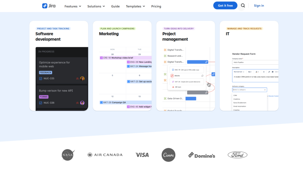 推荐理由:功能极其强大,深度支持敏捷开发全流程;自定义能力强,可配置复杂的工作流、字段和报告;拥有全球最庞大的插件生态 (Marketplace) 以拓展功能。