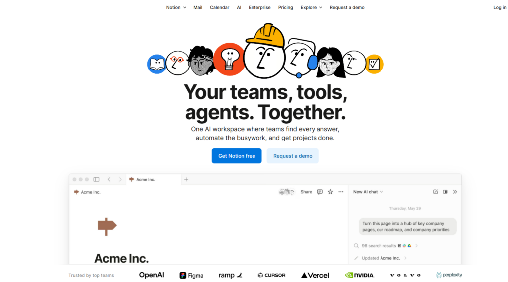 核心功能:块编辑器;强大的数据库与多视图;页面嵌套与双向链接;团队协作空间;丰富的模板库;Notion AI 助手。