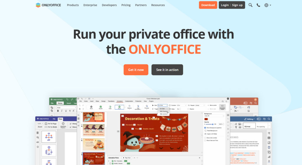 产品简介:一款开源的办公套件,提供功能强大的在线文档、表格和幻灯片编辑器,支持SaaS和私有化部署。