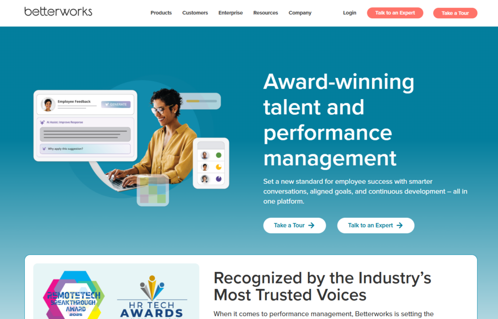 产品简介: BetterWorks 是一款国际顶尖的、专注于企业战略对齐和持续绩效管理的平台。它以 OKR 为核心,深度整合了员工的持续对话(Conversations)、反馈(Feedback)和认可(Recognition)。