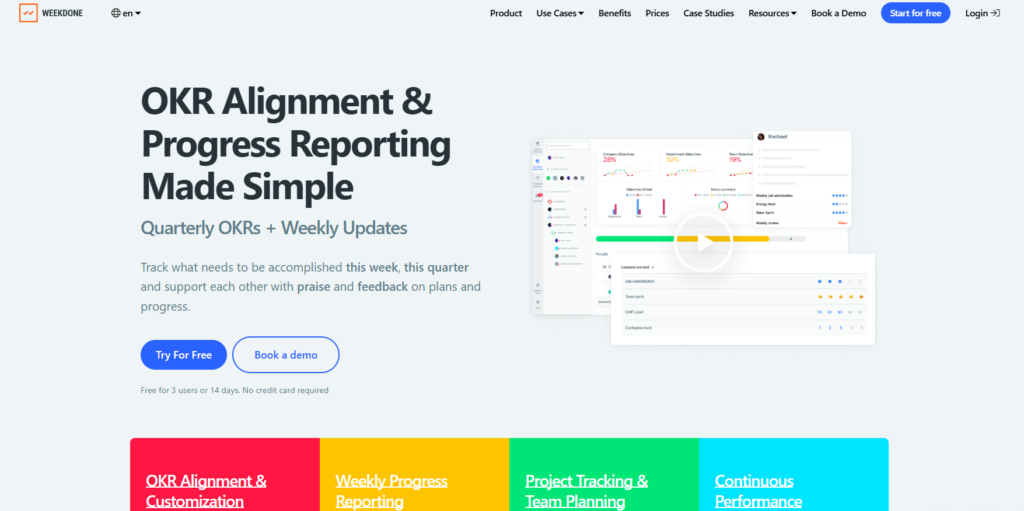 产品简介: Weekdone 是一款来自爱沙尼亚的OKR软件,它以“周”为核心节奏,通过(PPP)计划、进展、问题(Plans, Progress, Problems)的周报形式来推动OKR的持续进展。