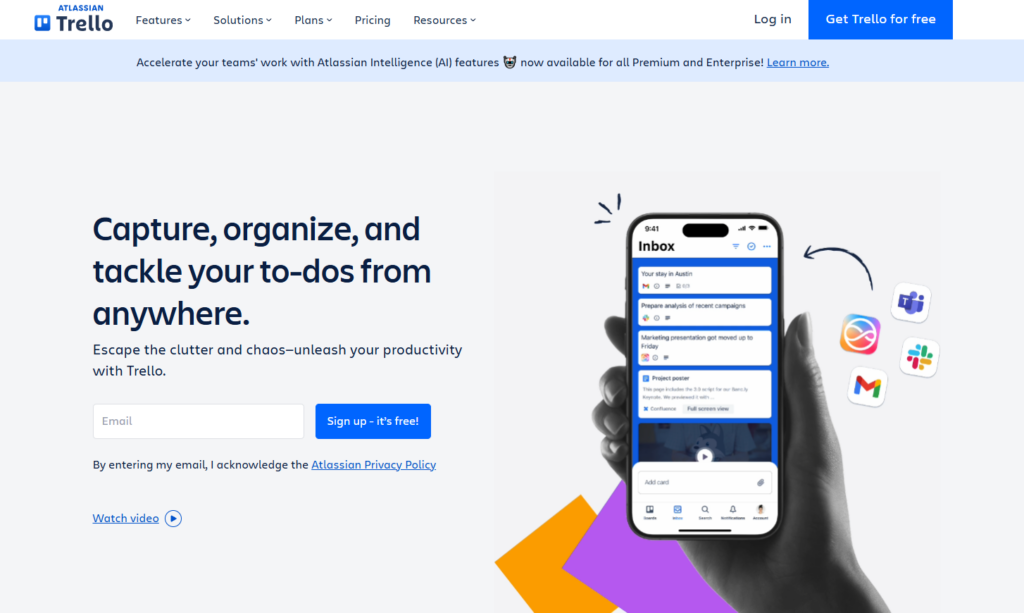 核心功能: 可视化看板;拖拽式卡片管理;标签、成员、截止日期;任务清单(Checklist);自动化助手(Butler);丰富的第三方应用集成(Power-Ups)。