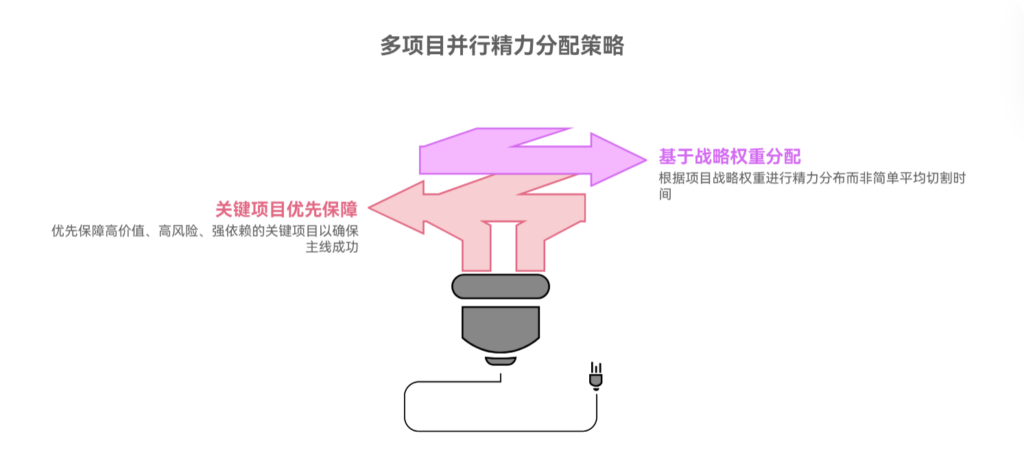 多项目并行时,产品经理最核心的精力分配策略是优先保障高价值、高风险、强依赖的关键项目,运用目标优先级管理与资源调度手段,以确保主线成功且分线不掉链。 换句话说,管理多个项目不是将时间平均切割,而是基于战略权重进行精力分布。正如管理学中常说:“重点不在于做更多,而在于做最重要的事。”产品经理必须学会取舍与聚焦,才能避免被工作拖着走。