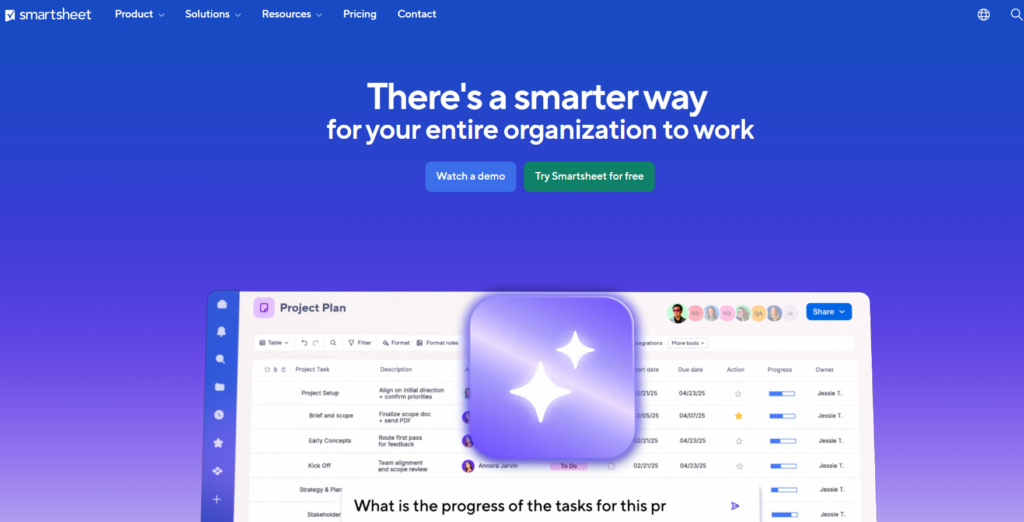 推荐理由: 对于习惯使用 Excel 进行管理的传统行业用户来说,Smartsheet 的迁移成本极低,几乎不需要额外培训即可上手。它拥有比传统表格更强大的功能,一键即可将表格数据转换为甘特图、卡片视图或日历视图。此外,它具备强大的数据计算能力和自动化工作流,可以设置复杂的条件格式和提醒规则,当某个单元格数据变化时自动触发后续流程,非常适合处理结构化数据密集型的项目。