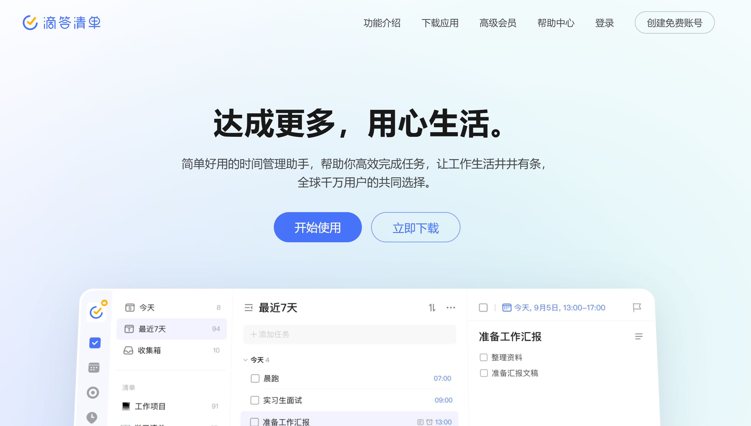 产品简介 滴答清单是一款由杭州随笔记网络技术有限公司推出的任务与日程管理应用,支持在手机、电脑、网页、智能手表等多平台同步使用。它以“任务管理 + 时间规划 + 专注提升” 为核心理念,帮助个人和团队更高效地组织工作与生活。