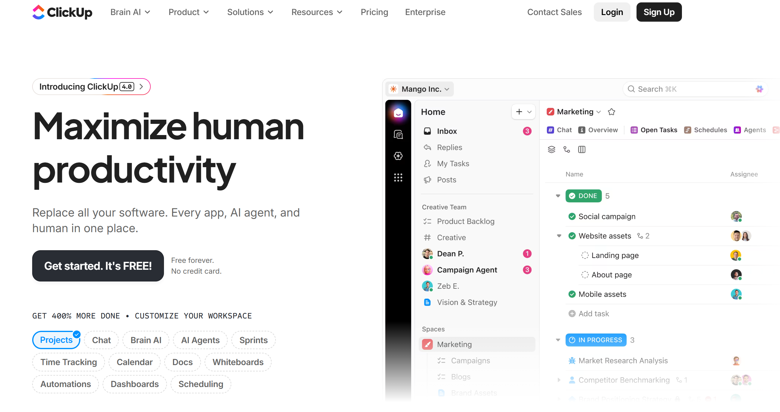 ClickUp 提供涵盖看板、列表、甘特图、日历、白板等在内的多视图方式,使团队能够以最适合的方式管理不同任务类型。系统的自定义字段、文档协作、自动化和集成能力,让它具备较高的灵活性。其一体化平台属性也让团队能够将任务、文件、目标、思维导图等内容统一存放,减少工具切换带来的成本。