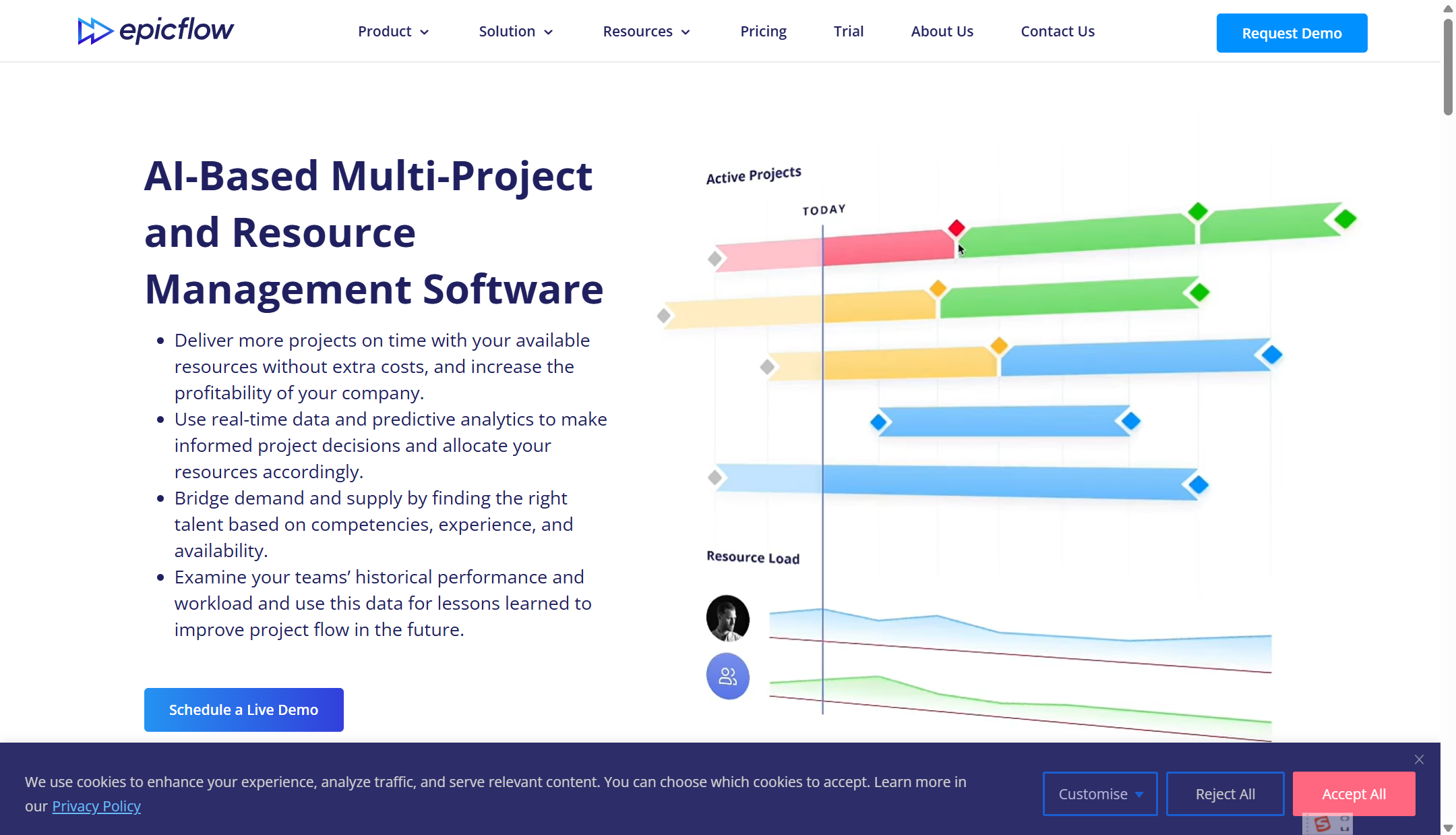 在资源冲突、任务依赖复杂、并发项目较多的环境中,Epicflow 能够帮助管理者识别资源瓶颈 (bottleneck)、自动优先级排序、优化资源分配顺序,从而显著提升资源利用率和项目交付效率。其 AI/智能特性使其在应对多项目调度冲突、资源过载或排期冲突时具有较强优势。