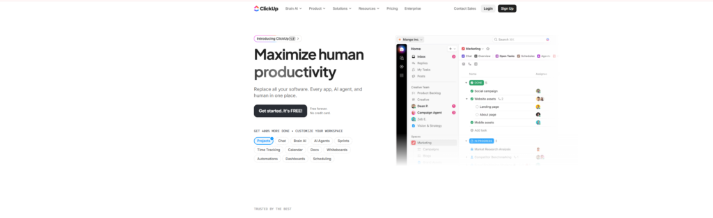 ClickUp 是一款定位为“一体化工作与项目管理”的平台,将任务管理、文档/白板、目标(Goals)、时间跟踪、表单与自动化整合在同一工作区中。其信息层级(Space→Folder→List)清晰,提供 列表、看板、日历、时间线/甘特、工作负载 等多视图切换,并支持自定义字段、任务依赖、模板库与权限分层,能够覆盖从轻量团队协作到较复杂项目排程的常见需求。对新团队而言,官方的行业与场景模板可缩短上手时间;对成长型团队,API 与与常见工具(如文档与IM、代码托管)的生态集成能减少多平台切换。