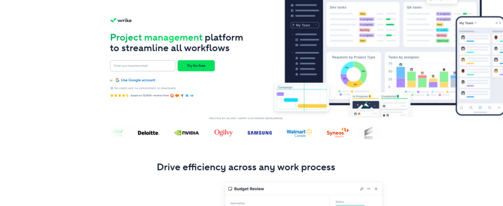Wrike 是一款面向企业与多团队协作的项目/工作管理平台,提供甘特图、看板、日历、报表与资源规划等模块,覆盖从计划、分配到执行与复盘的全流程。其产品线包含免费与付费分层,常见层级为 Free、Team、Business、Enterprise 等,支持试用;功能随层级递进,例如从基础任务管理到自定义流程、时间跟踪、实时报表与更高级的安全与治理能力。