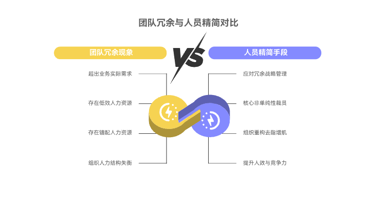 答:冗余(Redundancy)是“岗”的问题:即“这个岗位/职责”因战略调整或流程优化,不再被需要了。低绩效(Low Performance)是“人”的问题:即“岗位”仍然被需要,但“这个人”无法胜任该岗位的要求。精简策略应主要针对“冗余”。