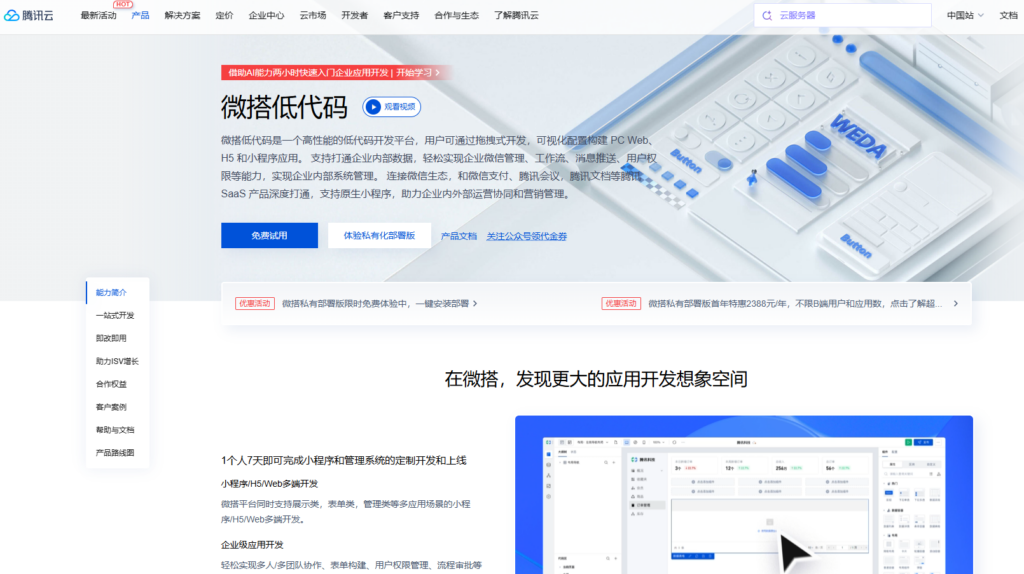 腾讯云微搭是腾讯云推出的云开发低代码平台,其最大的杀手锏在于对微信和企业微信生态的天然适配。开发者可以利用微搭快速生成小程序、H5应用以及PC端管理后台,实现一次开发多端运行。它底层依托腾讯云的强大算力,保证了应用的高可用性。