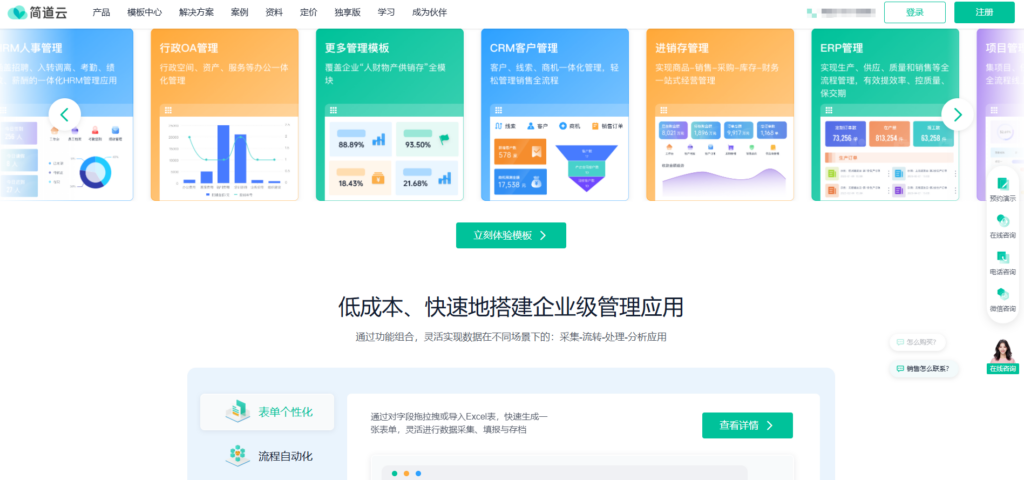 这款产品非常适合中小企业以及大型企业的业务部门独立使用。它内置了丰富的场景模版,从进销存管理到行政OA,用户几乎可以做到开箱即用。对于那些希望摆脱Excel混乱管理,同时又缺乏专业IT开发资源的企业来说,简道云是一个极具亲和力的入门级选择。