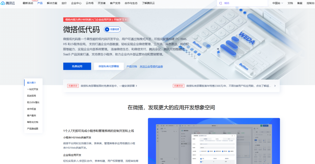 微搭WeDa是腾讯云推出的低代码开发平台,它深度融合了腾讯的生态能力。微搭最核心的优势在于与微信、企业微信的无缝连接,开发者可以利用它快速构建微信小程序、H5应用以及企业微信内部应用。依托腾讯云的强大基础设施,微搭提供了丰富的基础后端能力,如云数据库、云存储和云函数,让用户无需关心服务器运维即可拥有稳定的后端支持。