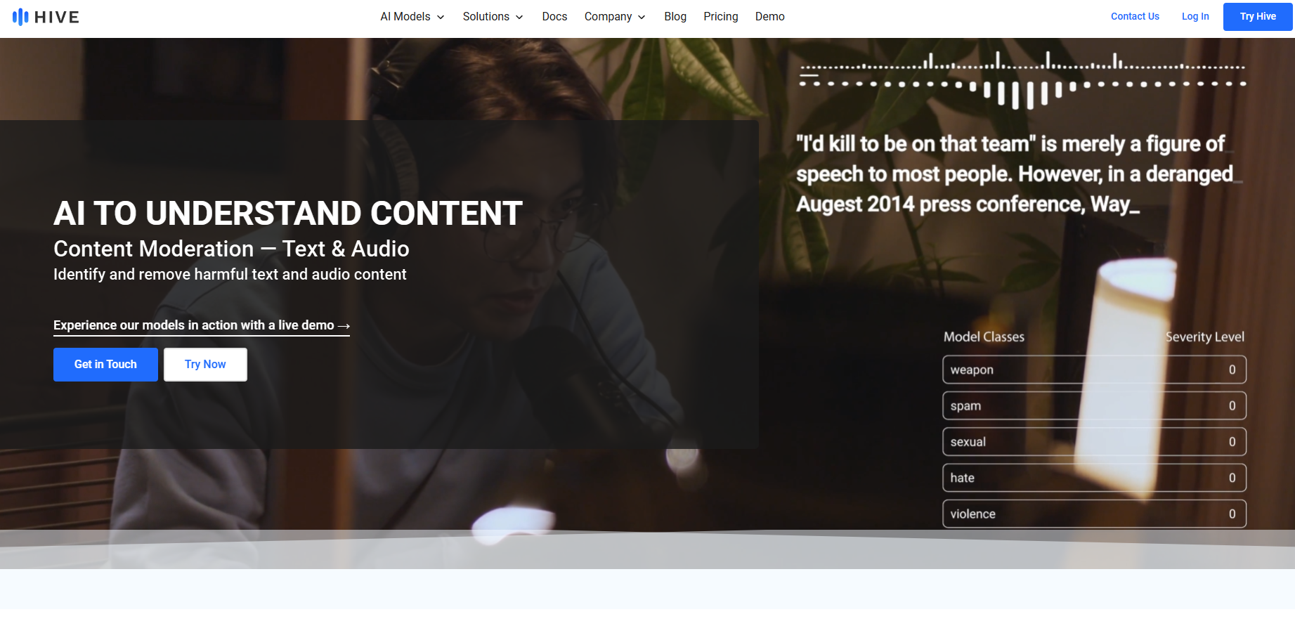 Hive Moderator是国际市场上主流的云端审核平台,以大规模机器学习模型和高质量的标注数据著称。其语音审核模型在识别违规、谩骂以及品牌提及方面具有极高的准确度,广泛服务于全球顶级的社交媒体和游戏平台。