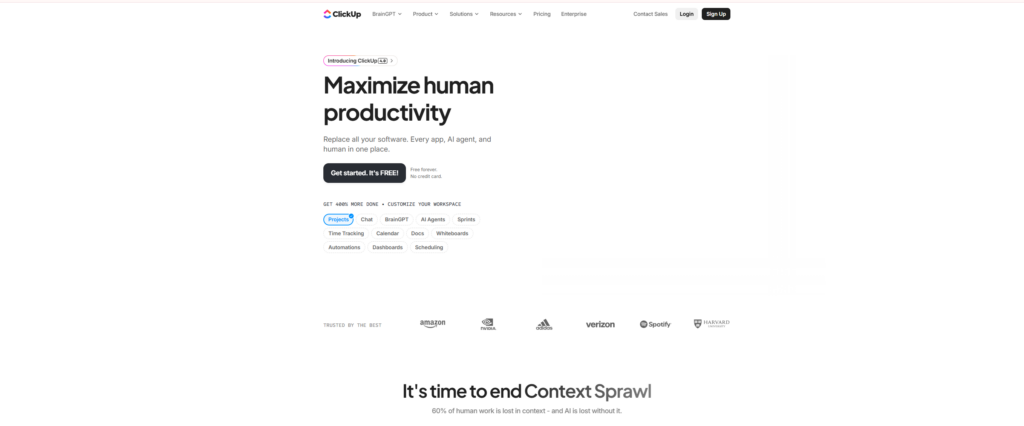 ClickUp 是一款主打“一体化工作平台”的项目管理工具,定位在把任务管理、文档协同、白板协作与沟通放到同一个工作空间里,减少团队在多工具之间来回切换。它提供多种常用视图与管理方式(如看板、表格视图、甘特图等),并支持把讨论与文档内容直接关联到任务,便于把“想法—计划—执行—交付”串成一条线。