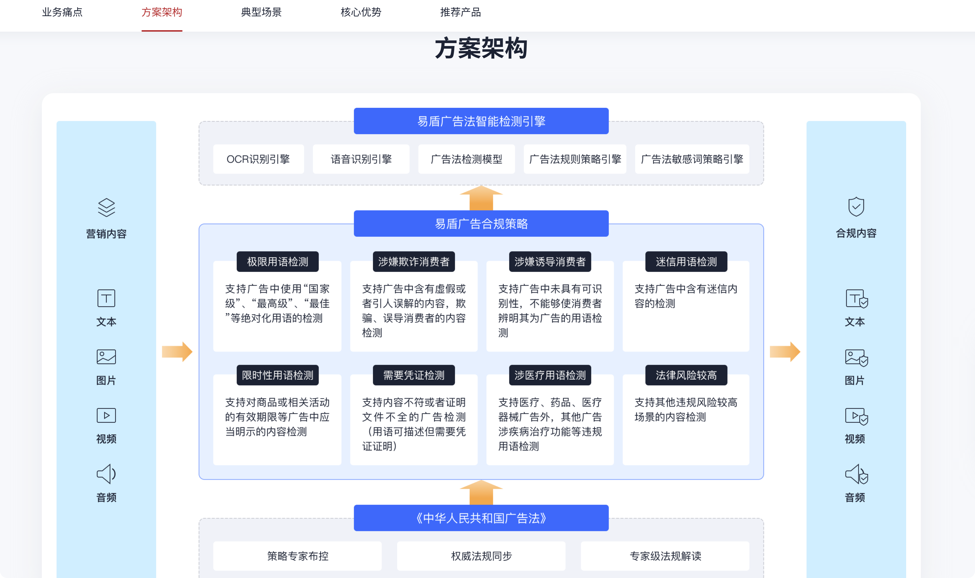 网易易盾这套广告合规方案,你可以把它理解成“广告素材的质检员 + 记录员”。在你把图片、视频、文案投放出去之前,它先帮你把内容快速过一遍,尽量把容易被平台拒审/下架、或者可能踩到广告法风险的地方提前找出来,避免上线后反复改、反复提审,影响投放节奏。