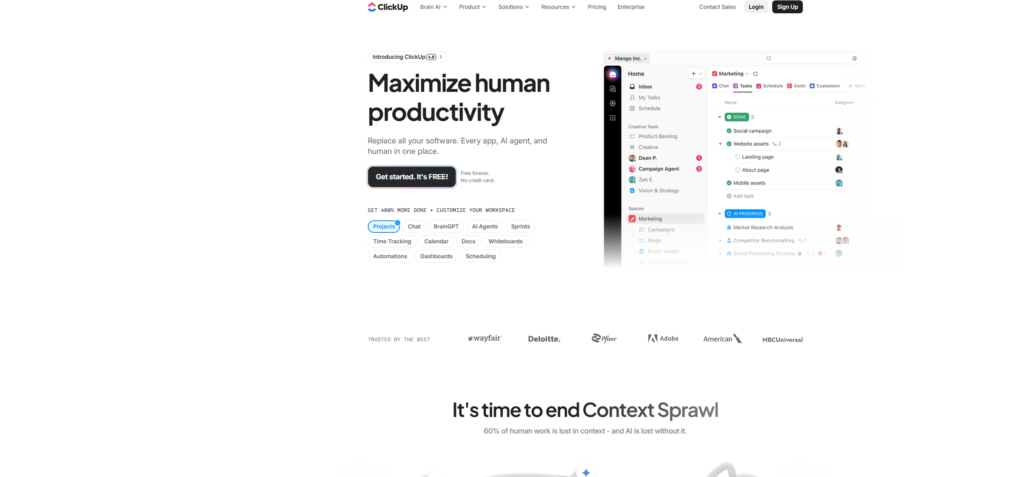 ClickUp 近年来热度很高,定位通常被概括为“把工作管理尽量一体化”,希望用一个平台覆盖更多类型的协作需求,适用范围不局限于研发团队。