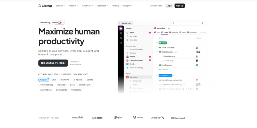 ClickUp的定位是“工作一体化平台”,在一个工作区里提供任务管理与多种协作形态,功能模块通常包括任务(Tasks)、文档(Docs)、目标(Goals)、白板(Whiteboards)、仪表盘(Dashboards)、聊天(Chat)与自动化(Automations)等,适合希望把项目推进、文档协作与可视化看板集中管理的团队。