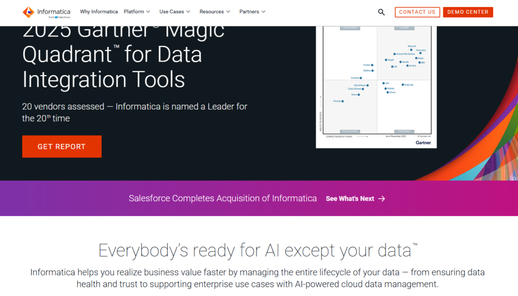 Informatica是全球数据集成与管理领域的领军厂商,其智能数据管理云(IDMC)集成了数据集成、质量管理、主数据管理(MDM)及数据治理等多种功能。它以强大的连接器库和自动化的元数据管理著称,能够轻松应对超大规模企业的复杂异构数据环境。