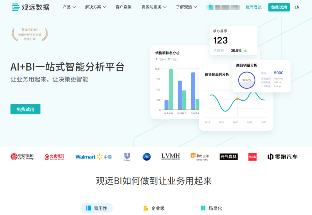 观远数据以AI+BI为核心理念,致力于为零售、消费及金融等行业提供敏捷化、智能化的数据分析与决策支持。其产品设计强调易用性和业务响应速度,旨在降低非技术人员使用数据的门槛,让业务部门能够快速构建数据看板并进行深度钻研。